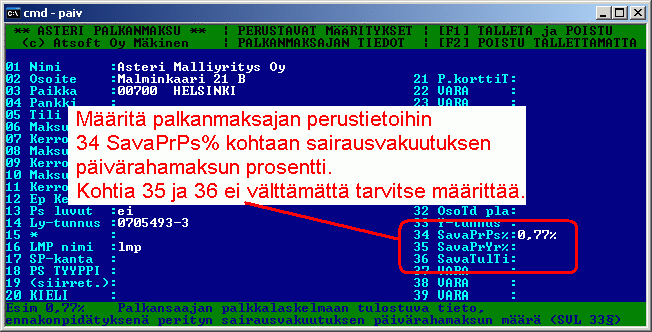 Sairausvakuutuksen päivärahamaksun suuruus määritetään palkanmaksajan perustietojen kohdassa 34 SavaPrPs%:
