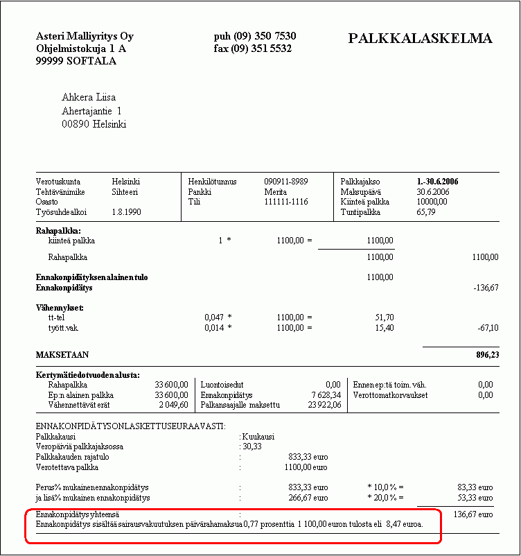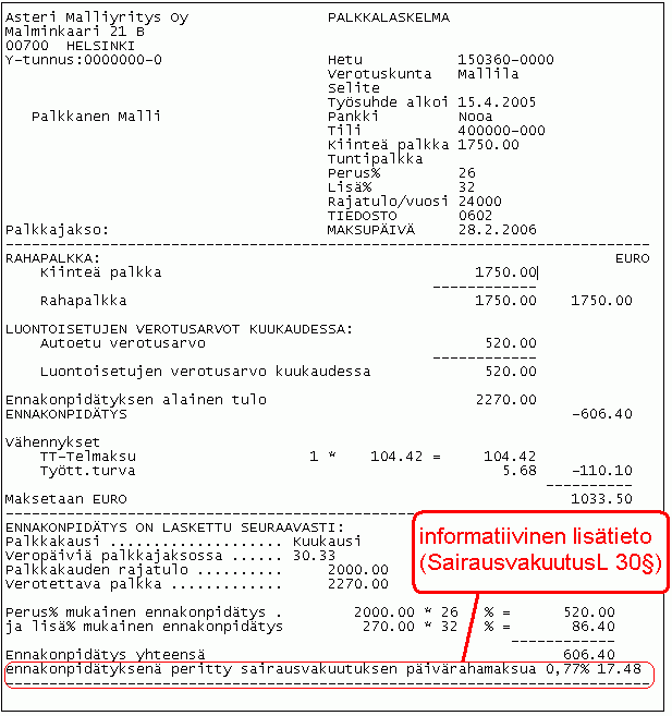 Palkkalaskelman ennakonpidätyslaskelmaosaan tulostuu ennakonpidätyksenä perityn sairausvakuutuksen päivärahamaksun määrä: