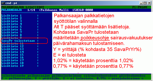Palkansaajan tietojen syöttöruudulta päästään lisätietoihin valinnalla Alt T. Lisätietojen kohdassa 10 SavaPr tulostetaan voidaan määrittää poikkeusohje tulostukseen, esimerkiksi poikkeava prosentti: