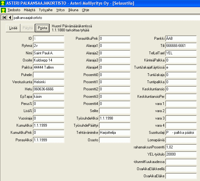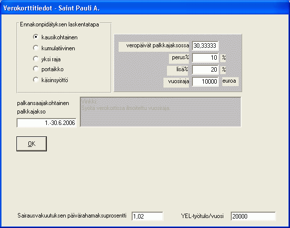3) Ensimmäisen palkanmaksukerran perustamisen yhteydessä varmista, että kaikille on tullut em. prosentit voimaan. Tämän näet ennakonpidätyksen kohdalta …-painikkeen takaa aukeavasta verokortti-ikkunasta, jonka alalaidassa näkyy sava-pvr-prosentti ja YEL-työtulo.