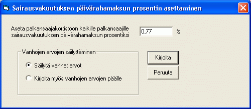 1) Palkanmaksuvuotta perustaessasi Palkansaajakortistossa ollessasi valitse Muokkaa|Päivärahamaksuprosentti. Aseta esimerkiksi kaikille palkansaajille 0,82 (kuvassa on vuoden 2006 arvo). Määritä "Kirjoita myös vanhojen arvojen päälle" niin aiemmat arvot muuttuvat.
