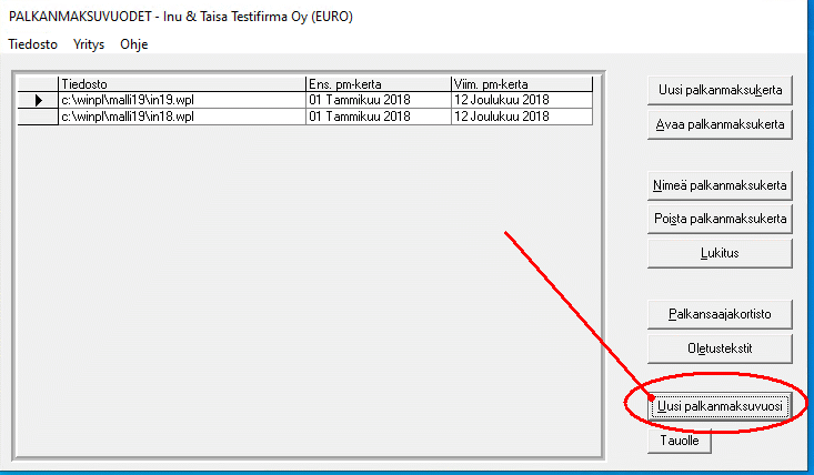 Aloita uuden palkanmaksuvuoden perustaminen palkanmaksuvuodet -ikkunassa aktivoimalla edellisvuuoden rivi ja napsauta [Uusi palkanmaksuvuosi].