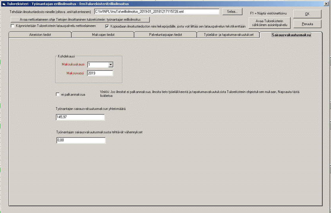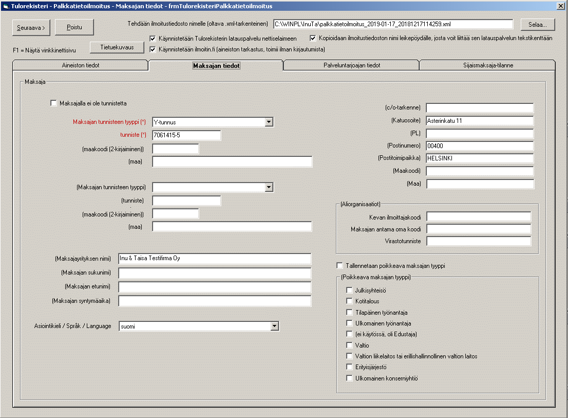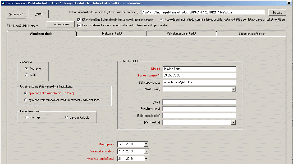 Ainakin yhteyshenkilön tiedot tarvitaan. Ylhäällä on oletuksena ruksittuna avattavaksi Tulorekisterin latauspalvelu ja ilmoittimen aineistontarkastus sekä kopioitavaksi ilmoitustiedoston nimi leikepöydälle. Näin lähettäminen ja validointi käy helposti: latausikkunassa painat ctrl + V saadaksesi automaattisesti tiedostopolun ja nimen.
