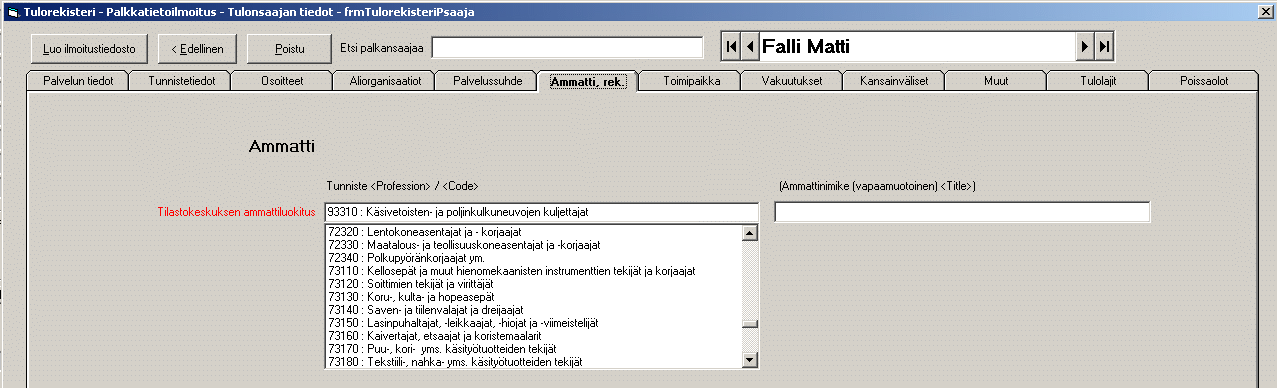 Pakollisia täydennettäviä tietoja ovat Ammattinimike tilastokeskuksen