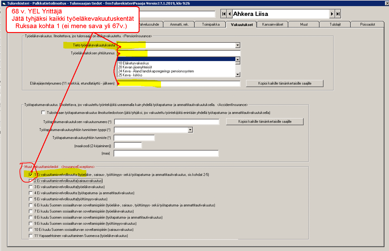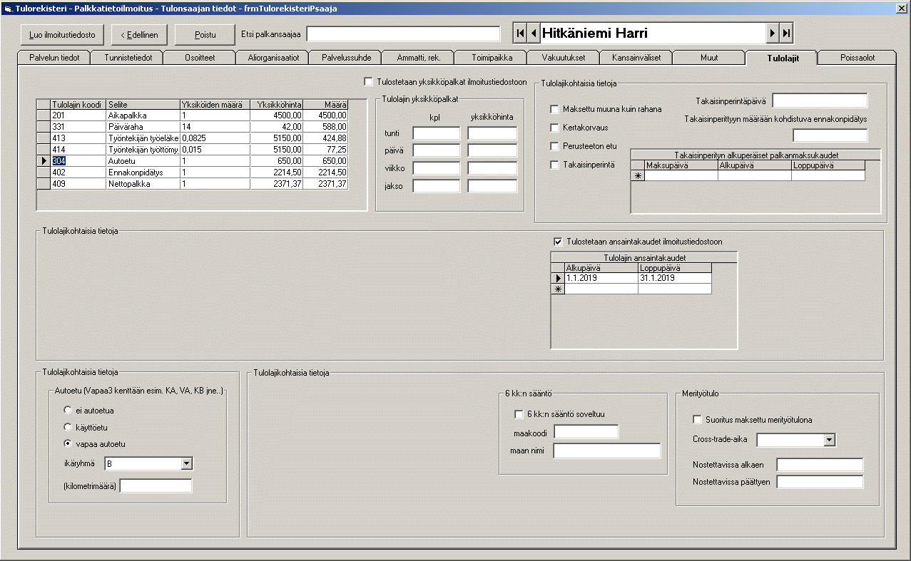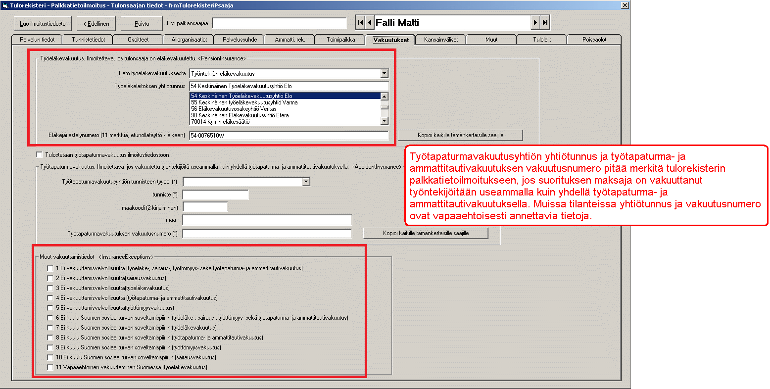 Ohjelma täytää palkansaajakortiston perusteella osan pakollisista tiedoista. Jos olet syöttänyt palkansaajakortistoon jostakin syystä ilmoitukseen kelpaamattomia tietoja, voit korjata niitä välilehdillä. Palkansaajan vaihtaminen onnistuu oikeasta yläkulmasta nuolinäppäimin.
