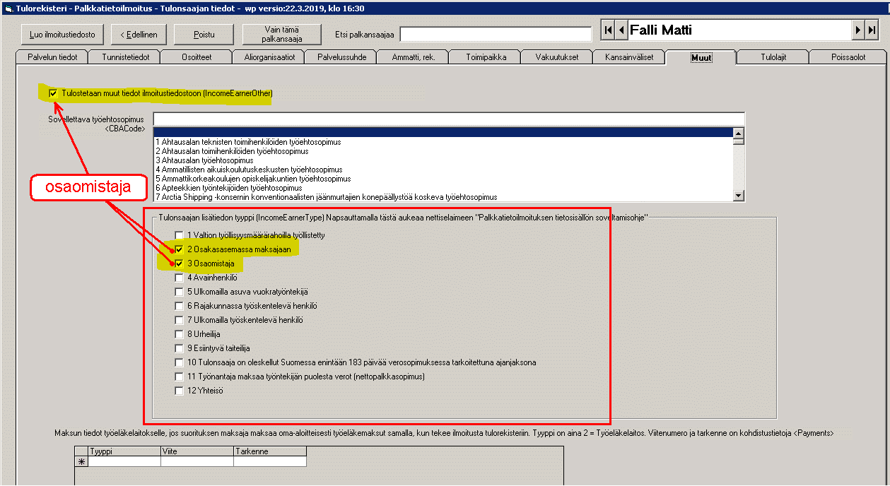 Sekä tulonsaajan lisätiedon tyyppi, mikäli tulonsaaja on osaomistaja ja/tai osakasasemassa maksajaan. Ruksaa myös kohta "tulostetaan muut tiedot ilmoitustiedostoon"