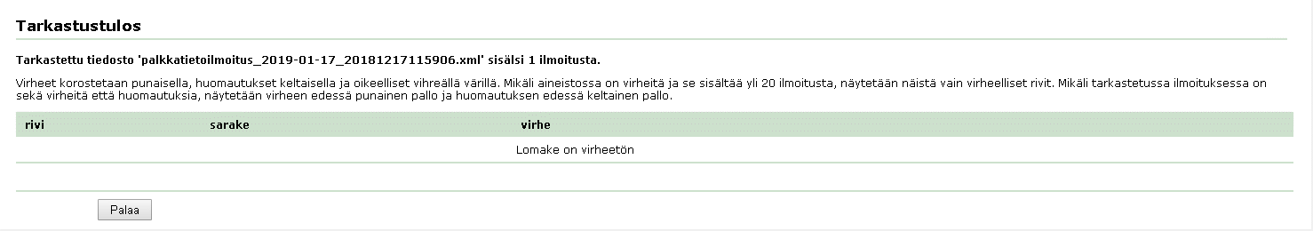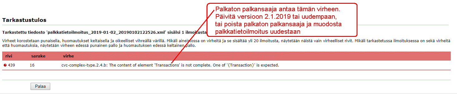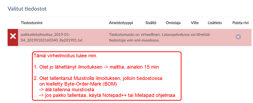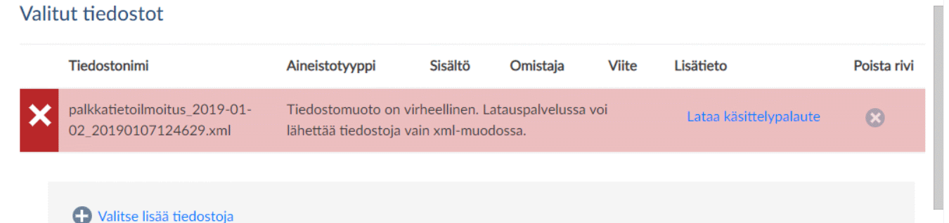 Lataa käsittelypalaute ja etsi XML tiedostosta rivejä, joissa lukee Tiedostomuoto on virheellinen. Latauspalvelussa voi lähettää tiedostoja vain xml-muodossa