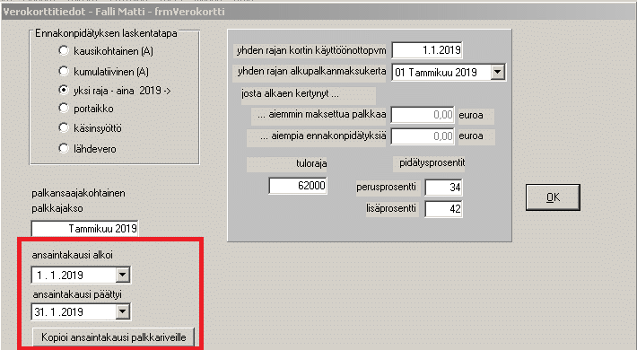 Palkanmaksukertaa perustettaessa syötetään oletusansaintakausi kaikille palkansaajille kaikille riveille. Henkilötasolla ansaintakauden voi muuttaa verokorttien syöttöikkunassa: