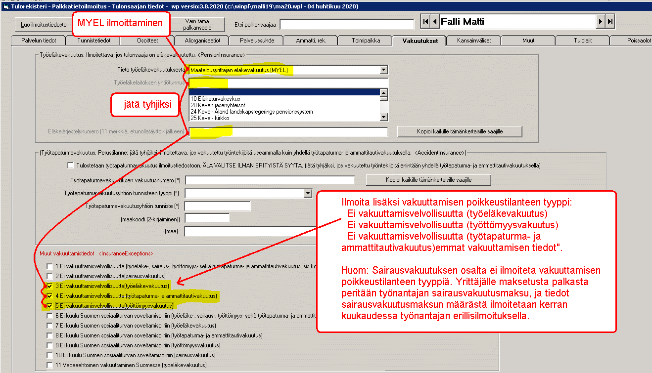 Versiosta 31.8.2019 alkaen voit palkkojensyöttötilassa palkkarivin vapaa3 kentässä ilmoittaa, minkä vakuutusten alainen tulolaji on, niille tulolajeille joille on sallittua ilmoittaa vakuuttamistiedont tyyppi. ks. artikkeli Vakuuttamistiedon ilmoittaminen tulolajikohtaisesti