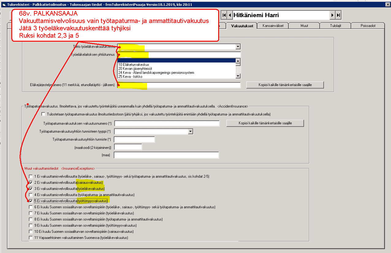 Tulonsaajan työeläkevakuutus (PensionInsurance) on pakollinen tieto