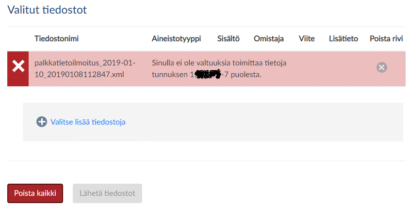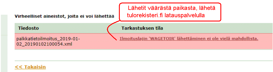 Tiedostomuoto on virheellinen. Latauspalvelussa voi lähettää tiedostoja vain xml-muodossa.