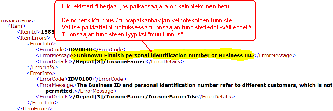 Unknown Finnish personal identification number or Business ID. Keinohenkilötunnus / turvapaikanhakijan keinotekoinen tunniste: Valitse palkkatietoilmoituksessa tulonsaajan tunnistetiedot -välilehdellä tulonsaajan tunnisteen tyypiksi "muu tunnus"